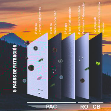 Suprime hasta las impurezas más minúsculas del agua sin recurrir a productos químicos abrasivos. Es 100% respetuoso con el medio ambiente, mascotas y, por supuesto, las personas. Su proceso se basa en utilizar varias etapas de presión para ir desligando del agua cualquier producto que no deba contener. El resultado final: Agua óptima para beber o cocinar, con un PH perfecto, a diferencia de la mayoría de los purificadores, especialmente de ósmosis inversa.